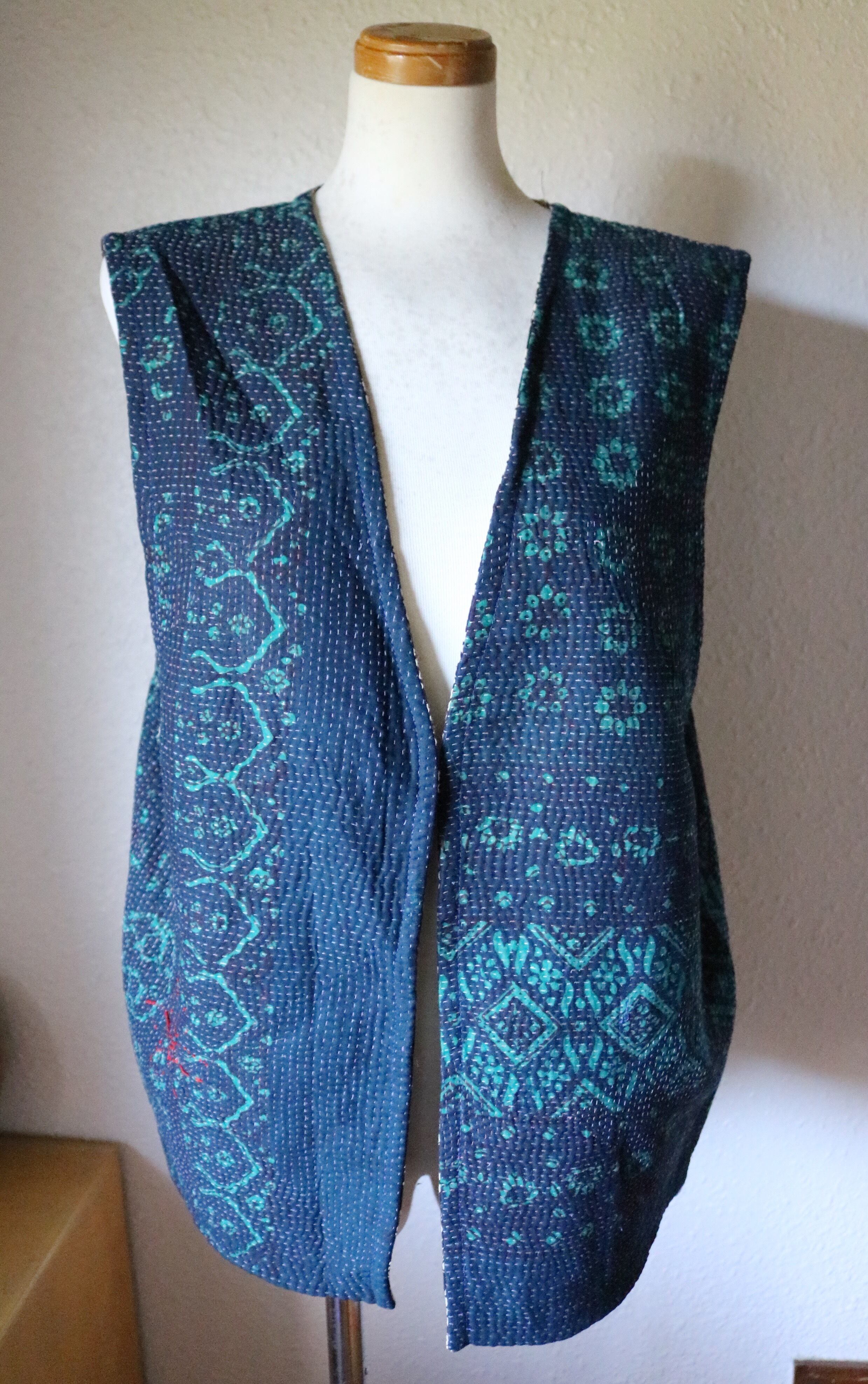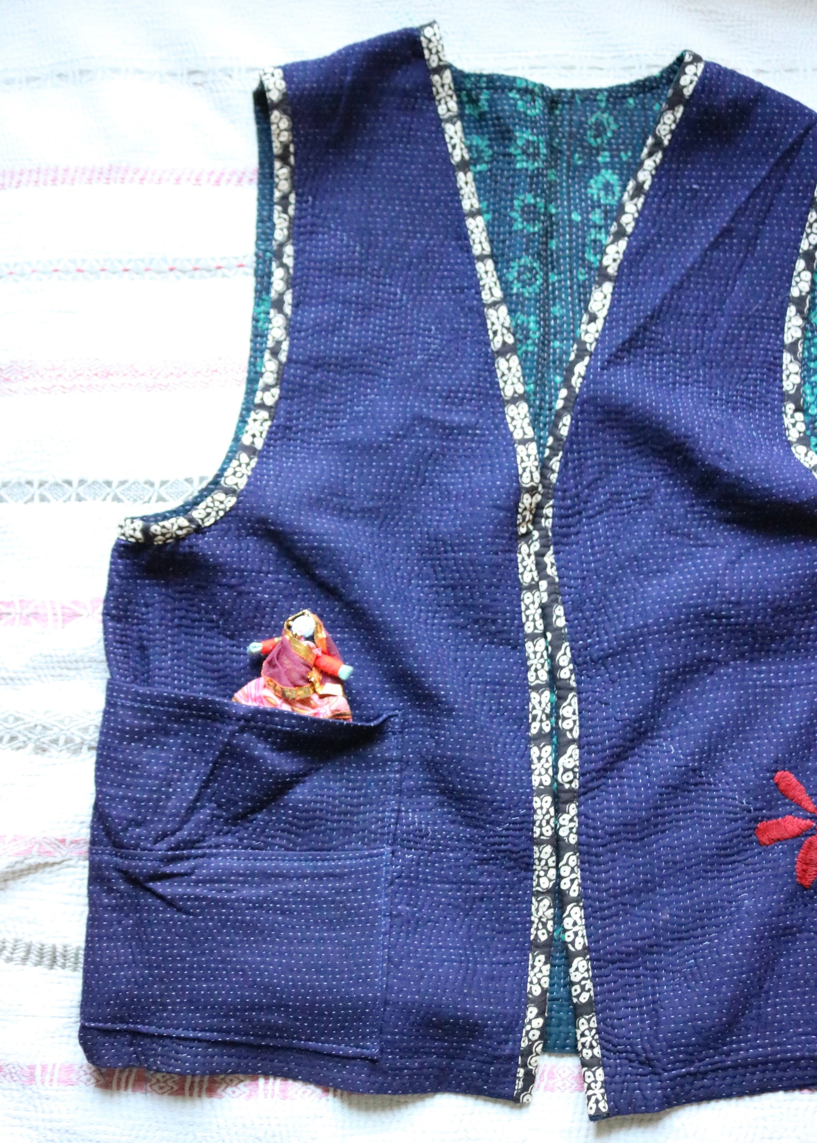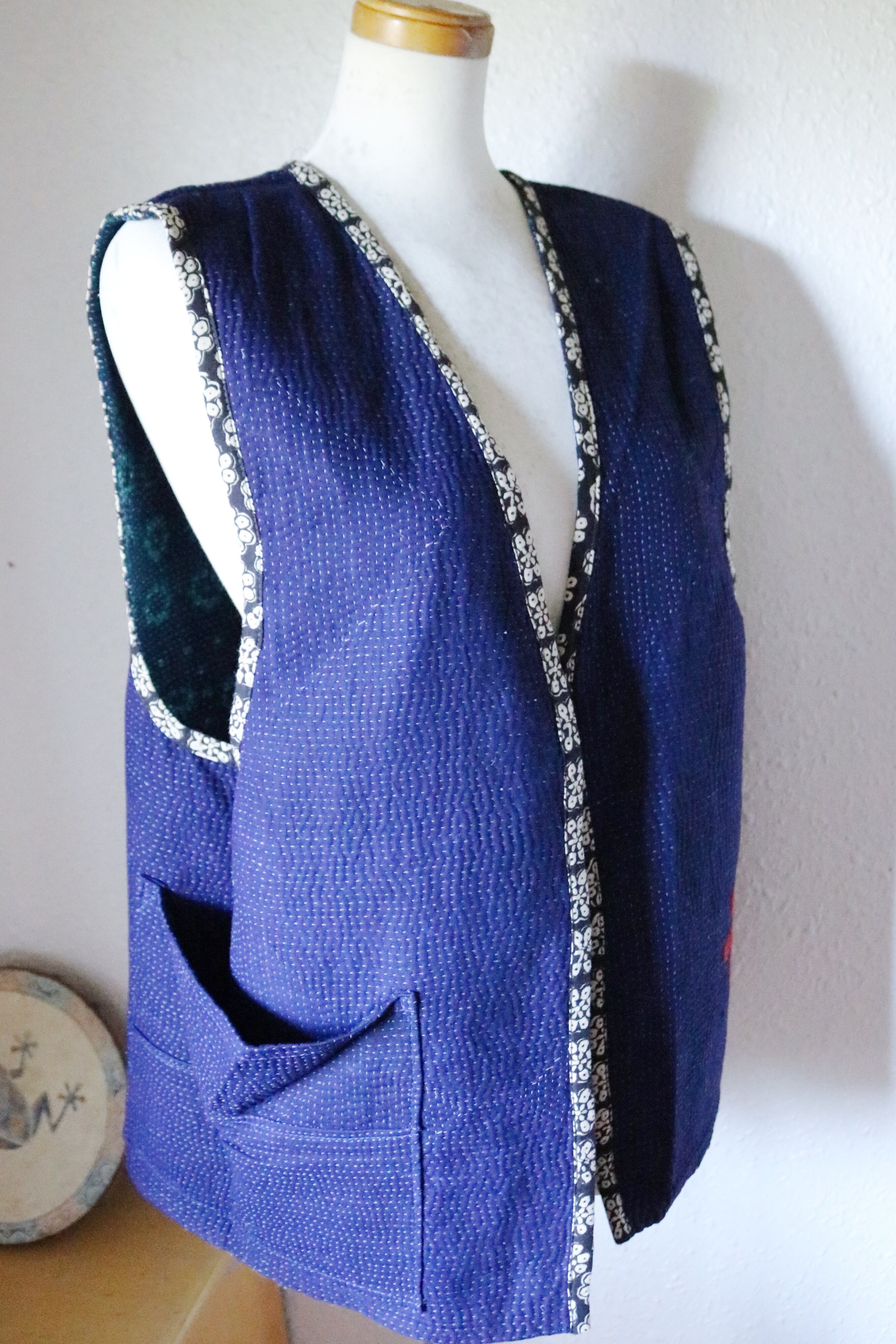 カンタキルトから仕立てたリバーシブルのベストです。